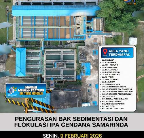 Samarinda – Perusahaan Umum Daerah Air Minum (Perumdam) akan melakukan pengurasan bak sendimentasi pada Instalasi Pengolahan Air (IPA) Cendana. Oleh karena itu para pelanggan diminta untuk menampung air secukupnya. “Pekerjaan pengurasan bak sindementasi akan dilakukan pada Senin (9/2/2026) dari pukul 08.00 WITA hingga selesai. Diperkirakan membutuhkan waktu pengerjaan 10 jam,” kata Taufik Minggu (8/2/2026) Ia […]